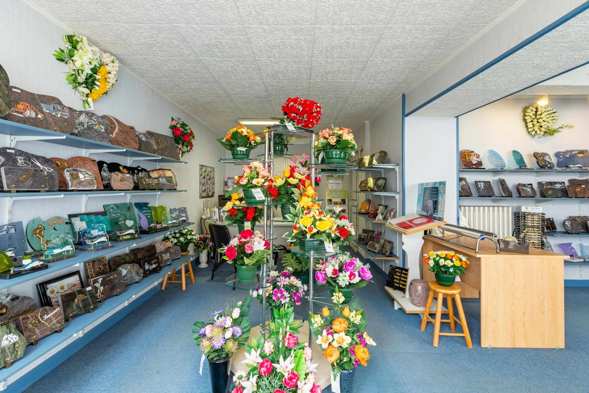 • – les articles : cercueil, capiton, urne, fleurs, plaques;